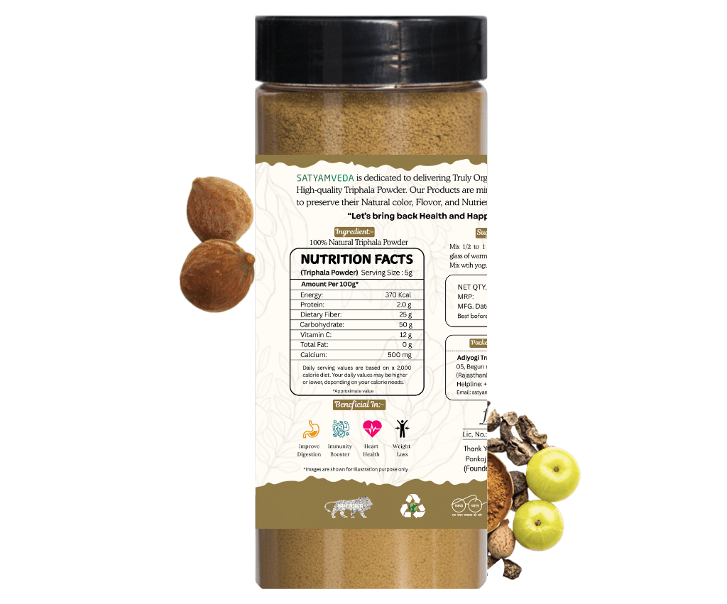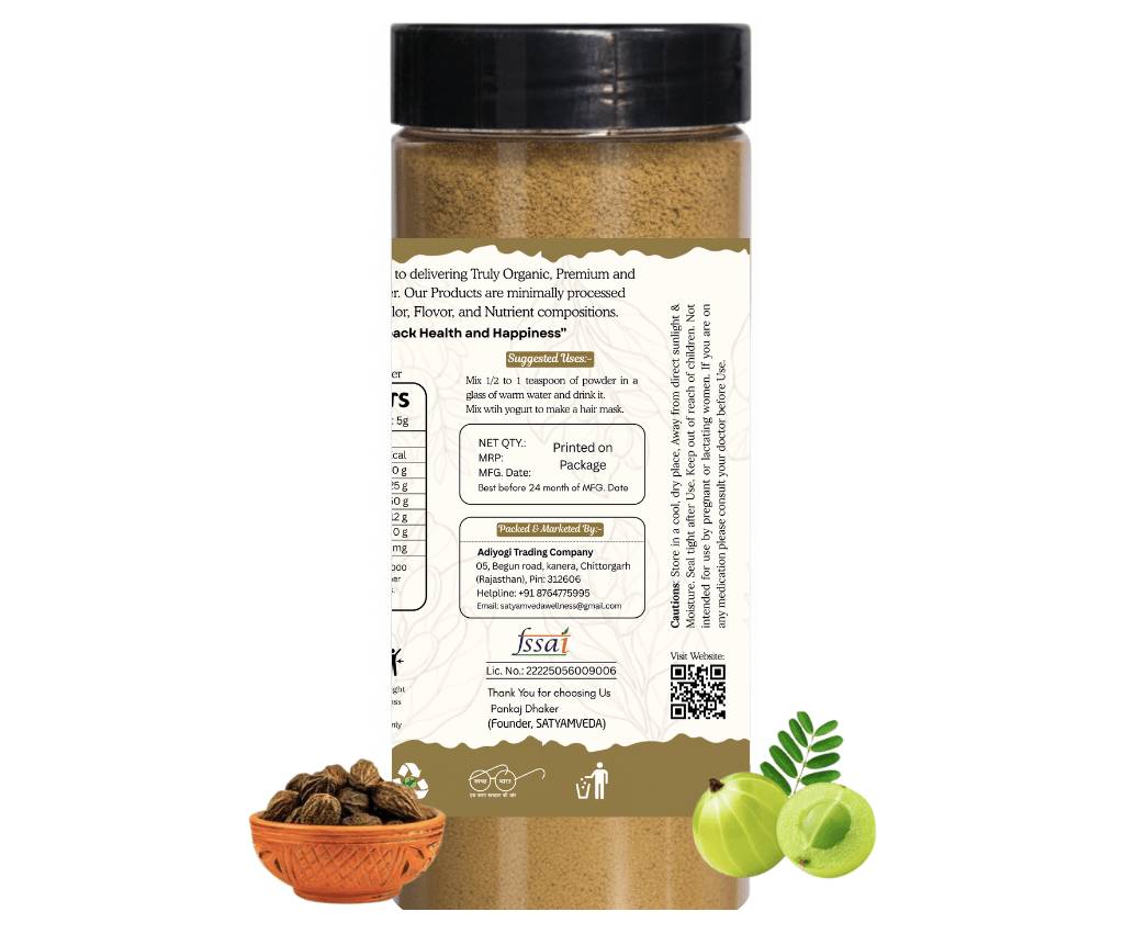 Discover the ancient wisdom of Ayurveda with SATYAMVEDA Triphala Powder — A power packed blend of 3 organic superfruits: Simple, Pure & 100% Natural! Sourced and Processed with utmost care for maximum purity, our Triphala powder is a potent digestive tonic that supports gentle colon cleansing, occasional constipation relief, and the regular elimination of waste. But beyond digestion, this “nectar of life” is packed with antioxidants that help to increase immunity, purify the blood and provide skin glow from within. SATYAMVEDA is not like the rest of them because we are free from artificial fillers, preservatives and adherents & GMOs. Just dissolve in warm water before bedtime to pop your body back into formation reestablishing natural internal harmony.